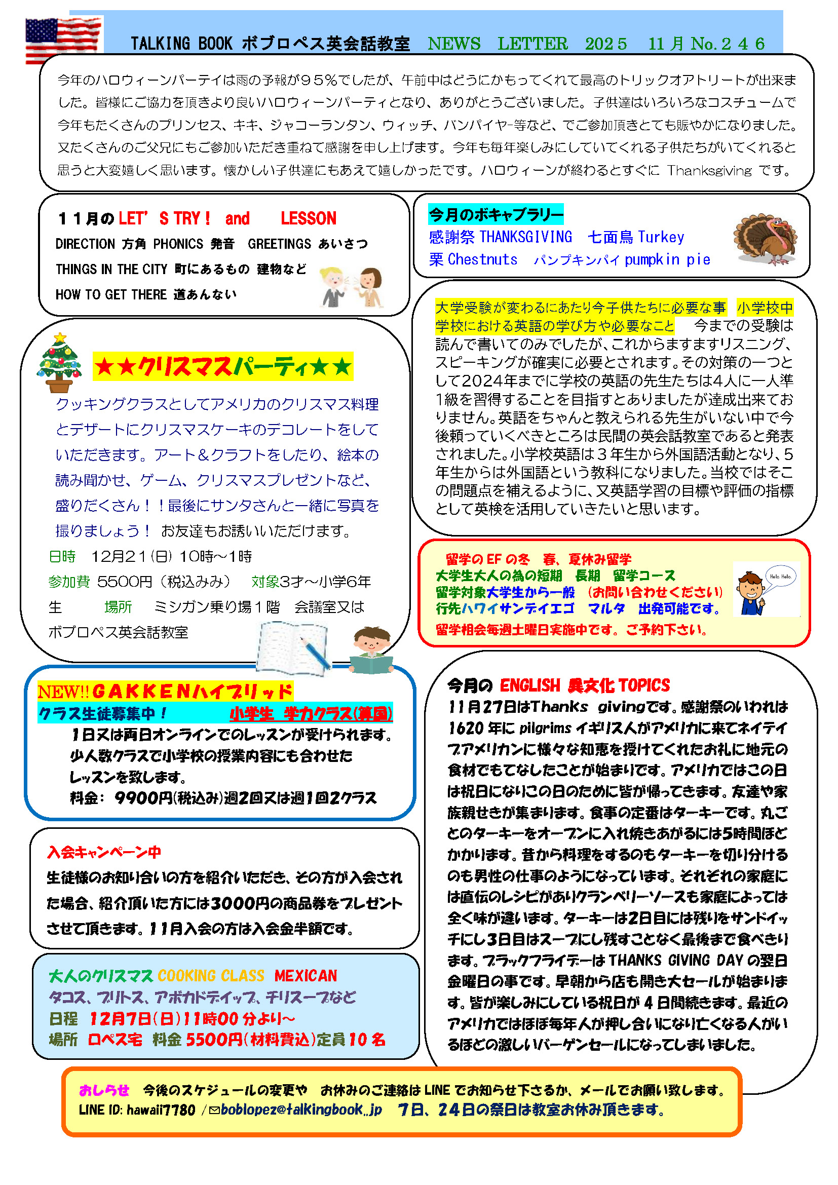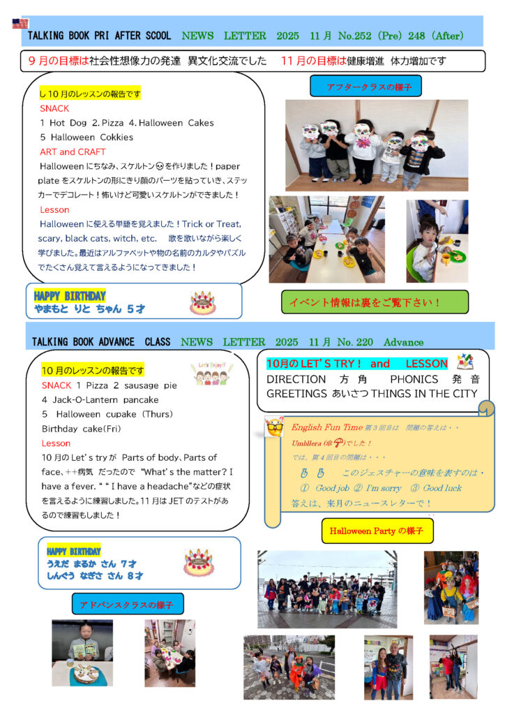 2025年11月3日 / 最終更新日 : 2025年11月3日 ボブ ロペス ニュースレター NEWS LETTER 2025年11月 No.258/No.252(Pre)/No.248(After) 表面レギュラー、裏面プリ、アフター、アドヴァンスクラスと、全クラスのニュースレターが1枚になりました。皆様にお届けしたい情報や子供クラスの日々のレッスン内容等をお伝えしていきます。 PDFダウンロード