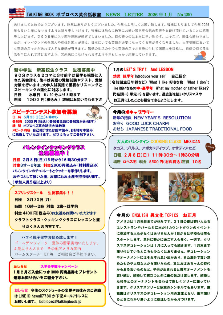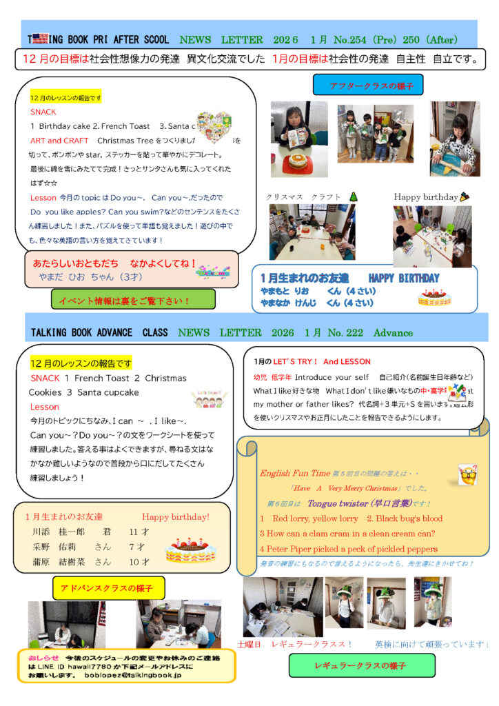 2026年1月13日 / 最終更新日 : 2026年1月13日 ボブ ロペス ニュースレター NEWS LETTER 2026年1月 No.260/No.254(Pre)/No.250(After) 表面レギュラー、裏面プリ、アフター、アドヴァンスクラスと、全クラスのニュースレターが1枚になりました。皆様にお届けしたい情報や子供クラスの日々のレッスン内容等をお伝えしていきます。 PDFダウンロード